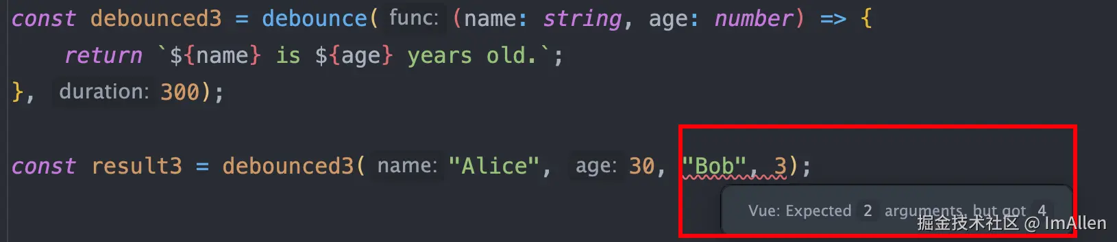typescript 代码解读 复制代码const debounced1 = debounce ((a: number , b: string ) => { console .log (a, b); }, 300 ); debounced1 (42 , "hello" ); // 正确,参数类型匹配 debounced1 ("42" , 42 ); // 错误,类型不匹配 在上面的例子中,TypeScript 会检查参数类型,确保传入的参数符合预期的类型。错误的参数类型会被及时捕捉。