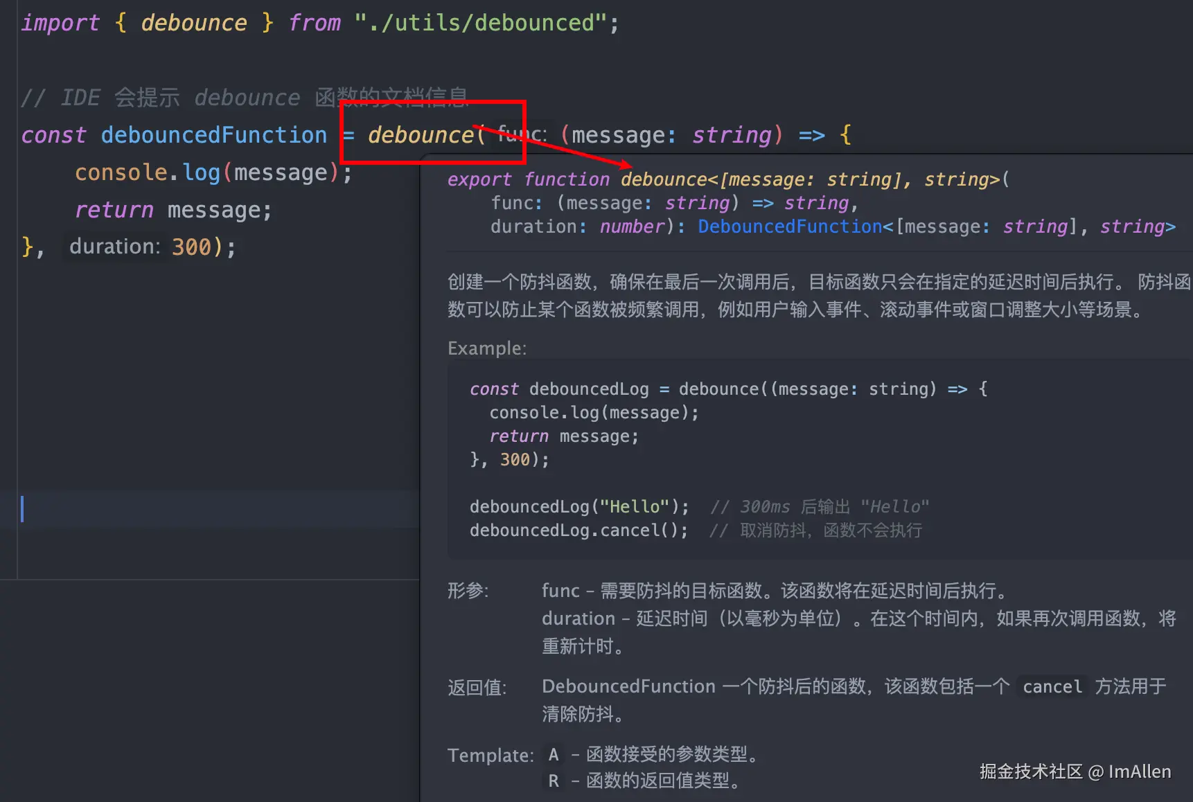 使用 JSDoc 生成文档 通过在 .ts 文件中添加 JSDoc 注释,可以借助 TypeScript 编辑器或 IDE(如 VSCode/Webstorm)自动生成代码提示和函数文档说明,提升开发体验。 例如,当开发者在使用 debounce 函数时,可以自动看到函数的说明和参数类型提示: