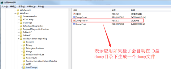 dump文件的收集 应用挂是一瞬间的事情,挂了之后就没办法生成dump文件了。所以首先要设置一下自动生成dump文件。 打开注册表HKEY_LOCAL_MACHINE\SOFTWARE\Microsoft\Windows\Windows Error Reporting
