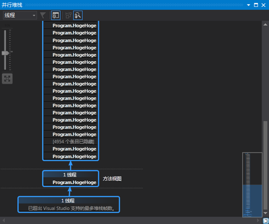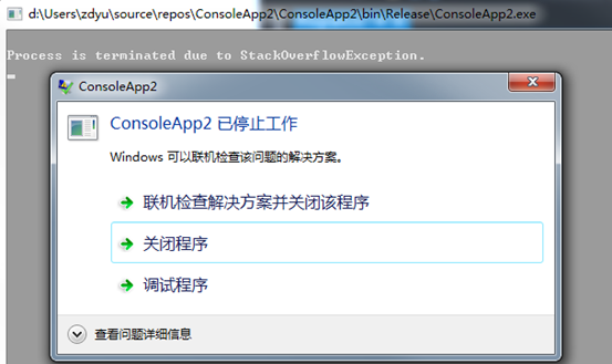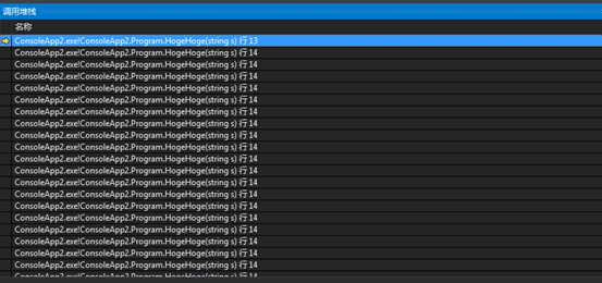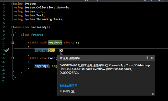 演示stackoverflow错误导致的crash 我们有创建一个简单的console程序 class Program { static void HogeHoge(string s) { HogeHoge(s); } static void Main(string[] args) { HogeHoge("hoge-"); } }