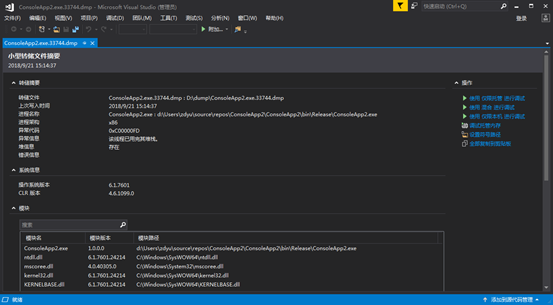 那我们分析下这个dump文件,用VS2017打开它,会出现它的概要信息