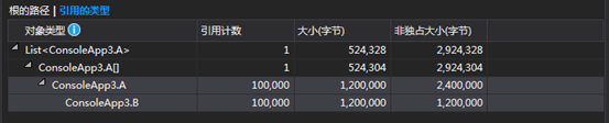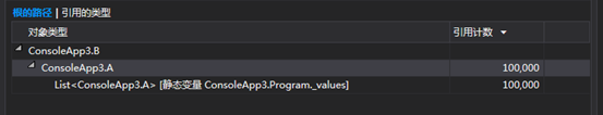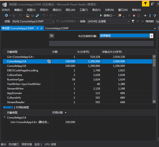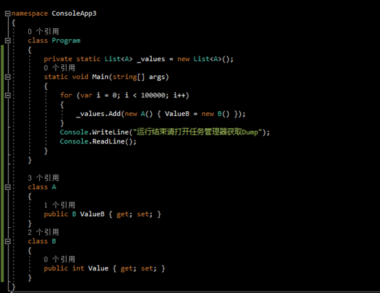 然后运行 一.用Visual Studio打开dump文件 点击按钮 【调试托管内存】 可以很清楚的看到有多少对象,每个对象共使用了多少内存 在这个一览下方有2个视图 分别是 1.根的路径 比如我们选择 ConsoleApp2.B 这个对象 从这个图可以看出来 B 这个对应 的 Paths To Root的追溯情况 (也就是构建最终要GC的Root) Program._values(static变量) -> List<A> -> B 我们可以看到values就是B的Root 只要values不存在那B就会纳入gc的回收对象中 因为我们是在Hold住了这个程序的main方法所以在这个时候B 对象还不能被gc回收 2.引用的类型 如何我们选择List<ConsoleApp3.A> 那么就会展示List<ConsoleApp3.A>的引用关系如下图所示: 从这个图我们可以看出来 List<A> 持有 A[] ,A[]持有 A,A持有B 以上根据这2个视图我们可以利用Vs来看出: 咦?这个对象占用内存怎么这么大 有点可疑 这个对象不是应该被gc吗,怎么没有被gc呢?研究下他的gc root看看