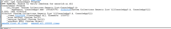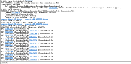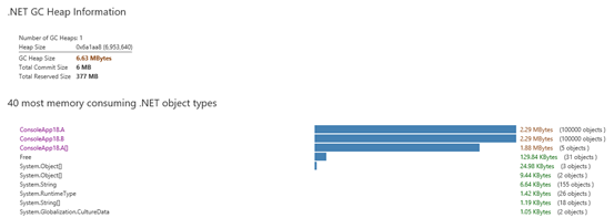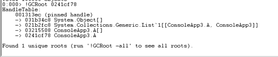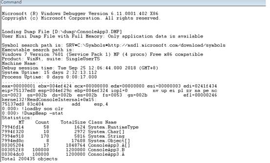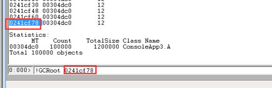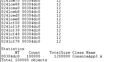 接下来我们用WinDbg来调查内存使用情况: 一般我们定位内存泄露问题,我总结的原则是要查到什么对象占用了大量内存,为什么它没有被GC。我们分以下几个步骤 1.统计内存中的对象&查找有异样的对象 使用命令 【!DumpHeap -stat】 可以把堆中的对象类型和size给打印出来 我们可以看出来 A 和 B 是可疑对象 2.根据类型查找存活对象一览接下来我们根据查找出A的一览 使用命令【!DumpHeap -live -mt <MT addr>】 结果如下: 可以看出内存中A类型的对象有100000个 3.探索从某个对象找出GC ROOT一览使用命令【!GCRoot 】