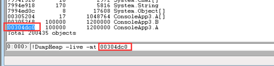3.!DumpHeap -live -mt <MT addr> 从MethodTable中查找存活的对象一览