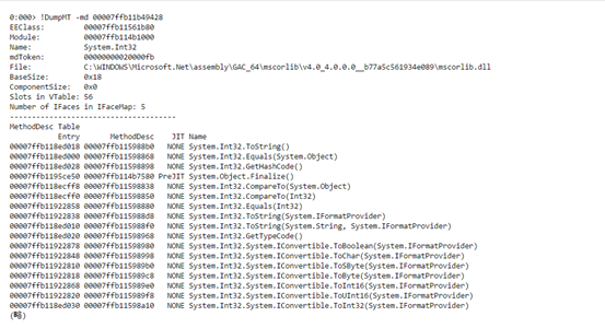 5.!DumpMT -md <MT addr> 查看类型信息 (加了-md参数会把这个类型下的方法(MethodDescriptor)都打印出来)