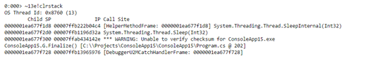 如上图所示, 用!Threads可以找出 Finalizer的线程为13.。接下来用命令 ~13k 查看线程执行栈,