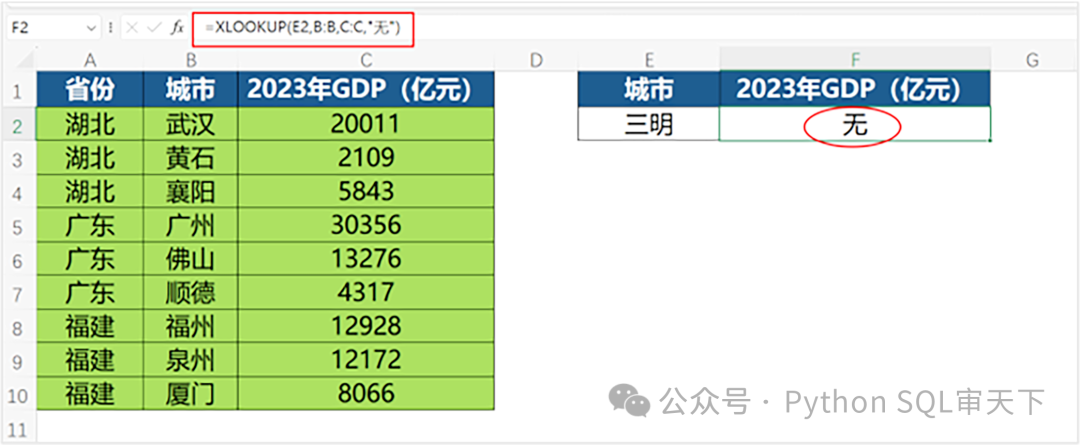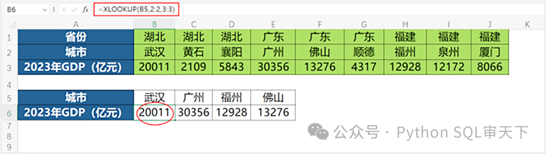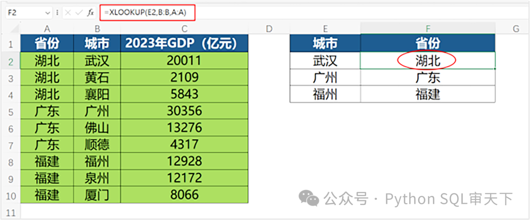 由城市查找所在的省份,如果用VLOOKUP就比较麻烦,而使用XLOOKUP非常方便。