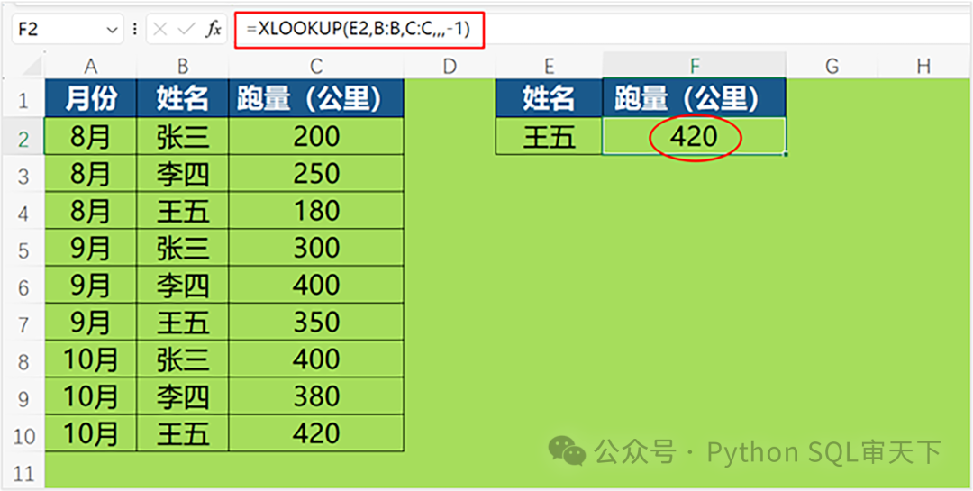 比如说我想查找王五在10月份的跑量,这个时候就要到第6个参数搜索模式了,-1表示反向搜索。
