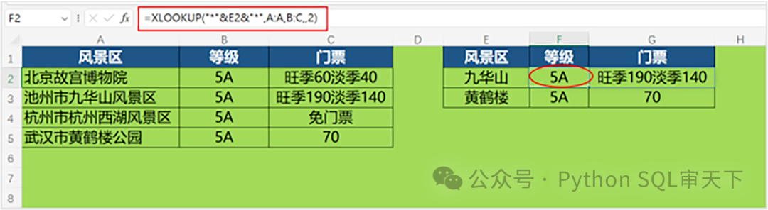 比如说我要根据风景区的简称查出它的等级和门票价格,这里就要用到第5个参数。