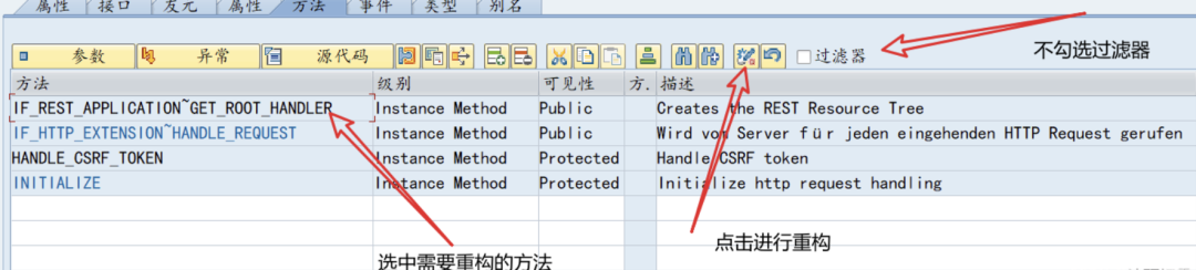 重构方法 IF_REST_APPLICATION~GET_ROOT_HANDLER,HANDLE_CSRF_TOKEN,其中HANDLE_CSRF_TOKEN 是用于token验证的,如果不需要token验证则直接重构即可,不需要代码,需要验证的话可以保留,无需重构。
