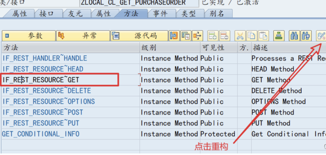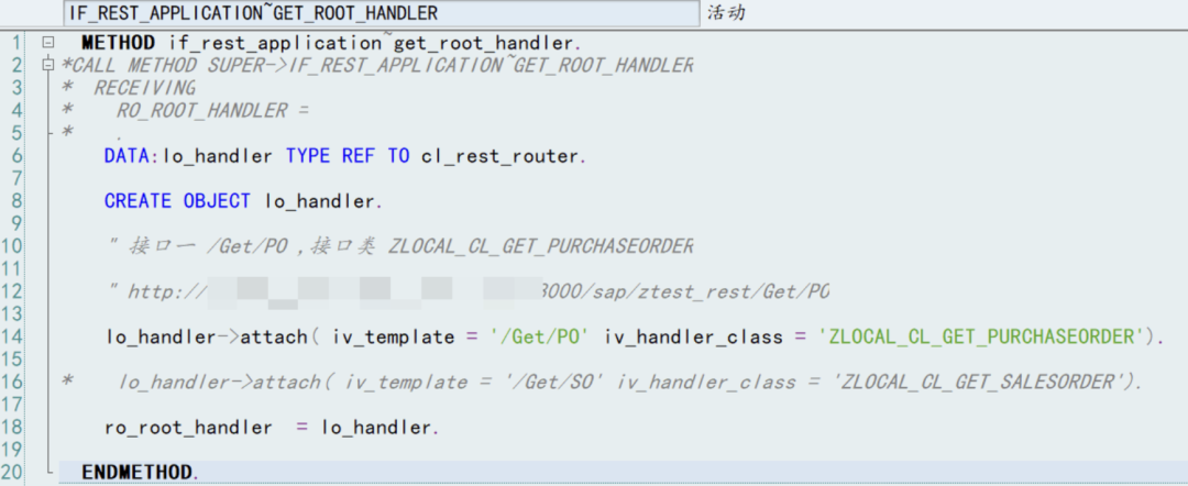 重构的代码,其中/GET/PO 为接口路径,ZLOCAL_CL_GET_PURCHASEORDER 为接口类