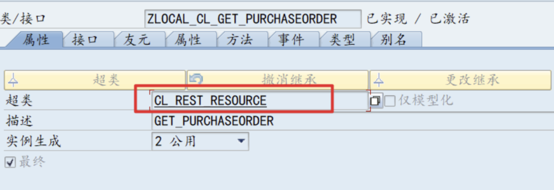 上述完成后,再次使用SE24 创建一个类,类名为前面的接口类 ZLOCAL_CL_GET_PURCHASEORDER.并且继承超类 CL_REST_RESOURCE。