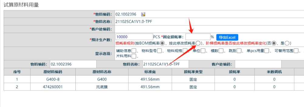 ![]() ![]() 损耗率规则:可以按bom已写的损耗率来计算,也可以手填的 点选框选择损耗率的规则用哪个