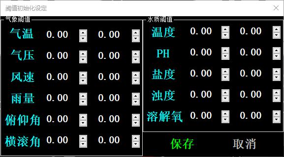 初始化阈值设定:点击初始化阈值设定按钮打开初始阈值界面,可设定传感器数据监测范围,设定完后保存。点取消退出设定界面。初始阈值数据保存本地,即软件刚使用时设定完即可,一般不可更改。