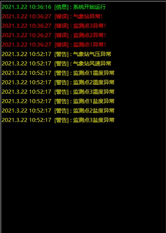 若监测点数据异常在消息界面以黄色警告字体提示,同时阈值显示界面异常数据文本变红色,且每分钟自动播放2秒提示音。