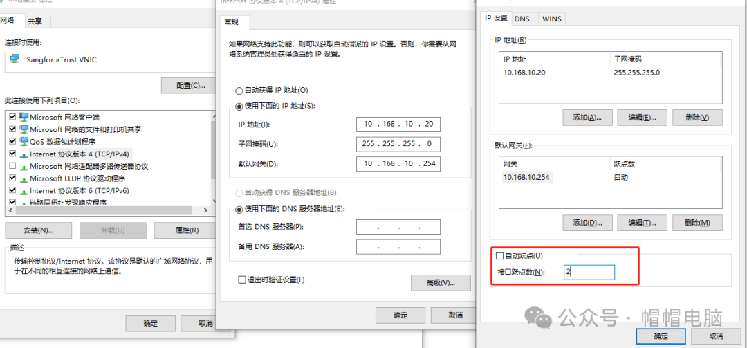 例如我下面,方法和无线的是一样的,唯一的区别是有线因为连接的是内网,会有静态IP设置,这里没关系,进入高级里面设置一下跳跃点比无线的数值大即可,记得设置好了依次点击确定退出来,没有点确定是不生效,很多新手在设置的时候明明操作是对的,就因为这个不成功。