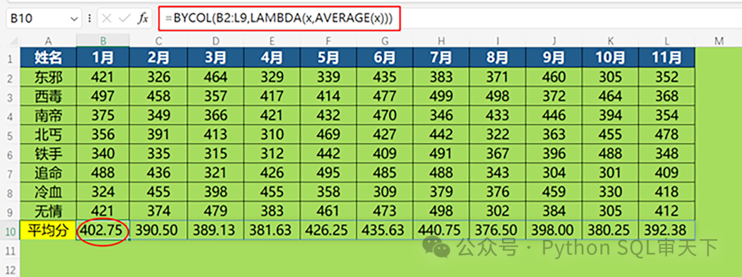 2、统计每个月份的平均销售量 =BYCOL(B2:L9,LAMBDA(x,AVERAGE(x))) 这个公式的理解和上面的类似,只不过是遍历每一列。