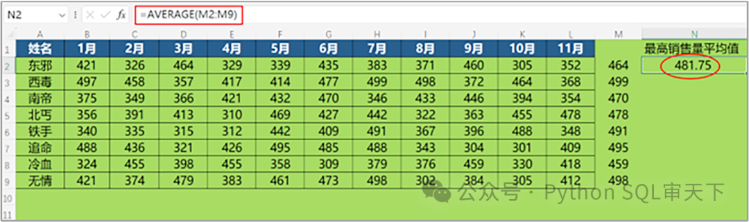 倘若在这个时候能够利用BYROW 函数的话,那整个操作过程可就要简单得多啦。 =AVERAGE(BYROW(B2:L9,LAMBDA(x,MAX(x))))