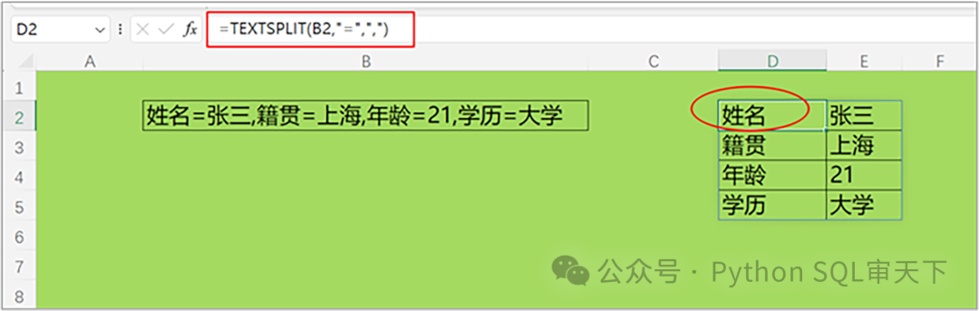 我们再来看下面这个例子,同时拆分行和列: =TEXTSPLIT(B2,"=",",") 第2个参数“=”拆分成多列;第3个参数“,”拆分成多行。