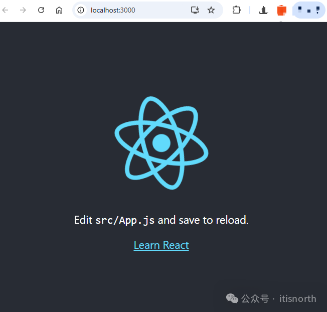 react 默认使用 3000 端口作为本地开发环境,它自动使用浏览器打开,就能看到如下界面:
