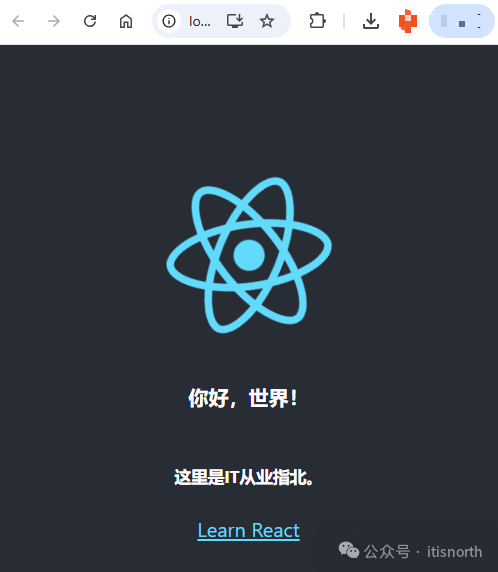 import logo from './logo.svg'; import './App.css';  function App() {   return (     <div className="App">       <header className="App-header">         <img src={logo} className="App-logo" alt="logo" />         <h4>你好,世界!</h4>         <h5>这里是IT从业指北。</h5>         <a           className="App-link"           href="https://reactjs.org"           target="_blank"           rel="noopener noreferrer"         >           Learn React         </a>       </header>     </div>   ); }  export default App;