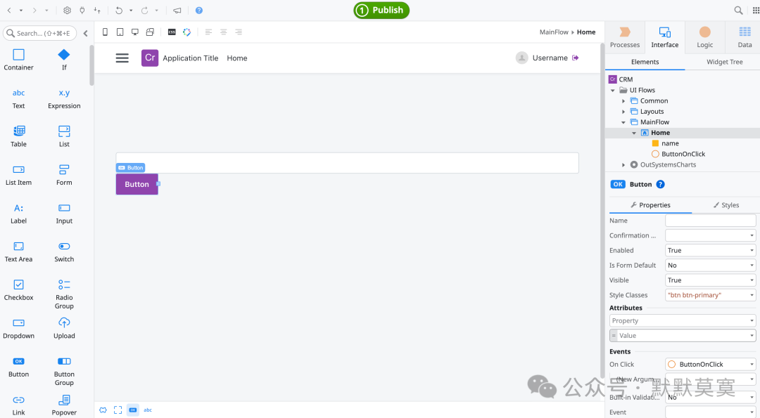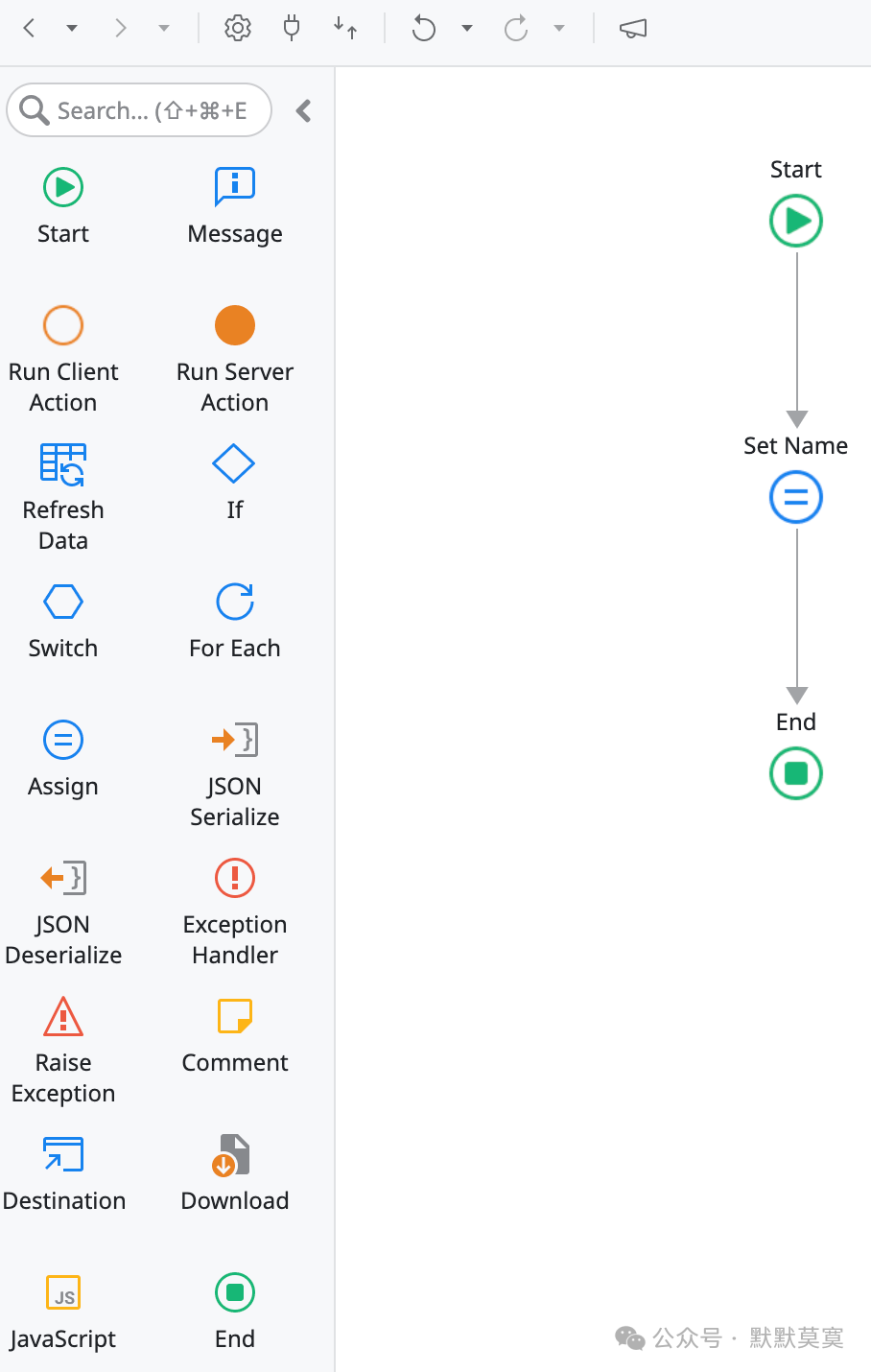 3. 逻辑 SF 现在主推的逻辑流是 Flow,流程节点包括:流程控制(分支、循环)、数据处理(增删改查、数组处理)以及平台封装的动作(发邮件)等。 SF 主要是通过数据的增删改操作触发Flow,不开发的情况下无法实现通过单个前端组件的事件触发。 ![]() SF Flow 部分节点 Outsystems 则是通过页面组件的事件触发前端逻辑流 Client Action,比如上面 Outsystems 设计器的截图中,按钮就是通过 On Click 事件触发名为 ButtonOnClick 的 Client Action。 不同组件支持不同事件,比如输入组件支持 On Change、On Focus、On Blur 等事件,其实就和写前端 JS 代码差不多了。 Client Action 如下所示,类似一个方法,可以接收入参,但没有返回值。