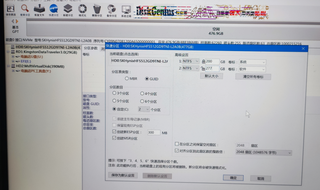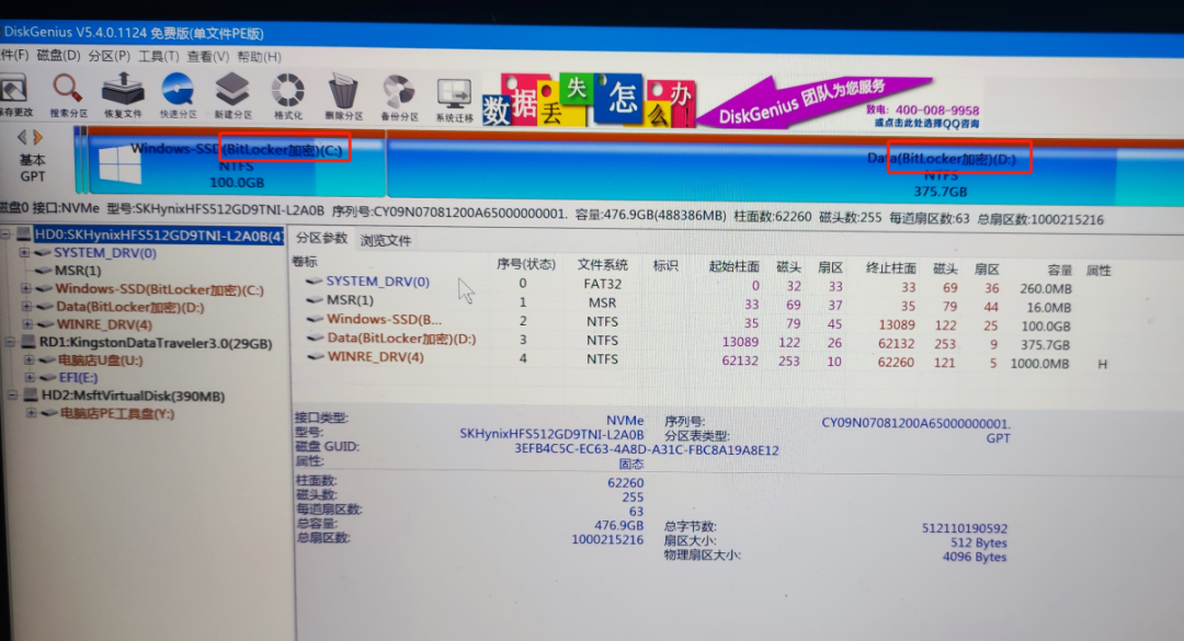 进入PE系统准备重新划分分区,然后安装系统,这时我们在DiskGenius中可以看到,C盘和D盘都是有bitlocker加密的。我在几年前第一次看到这样的情况的时候,直接把C盘删除,重新安装系统,结果安装完系统之后,D盘打不开了,所有数据都没有找回。反正这次我已经把客户C盘和D盘数据都备份了。可以直接全部删除,重新分区。