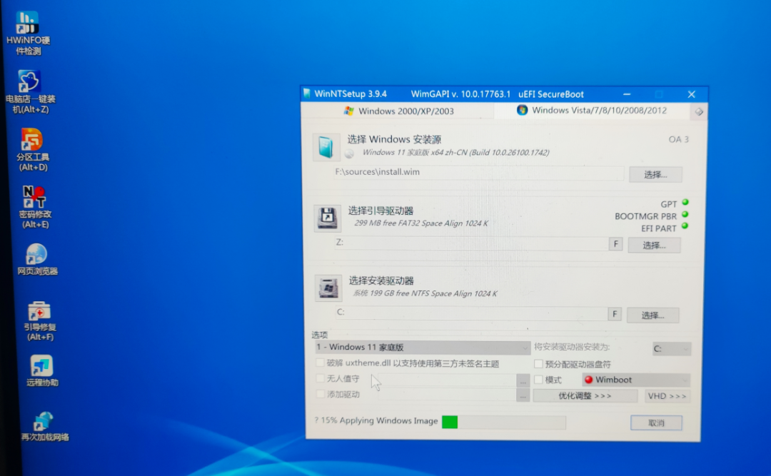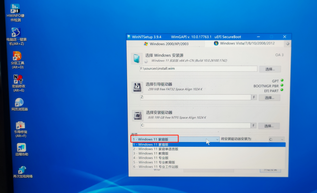 开始安装系统,还是安装win11家庭版本,为什么要安装家庭版本呢?因为现在的笔记本都是自带家庭正版操作系统,密钥在主板上,所以直接安装家庭版本,系统安装完成之后,就直接正版激活了。不需要再去用激活工具,去进行盗版激活了。