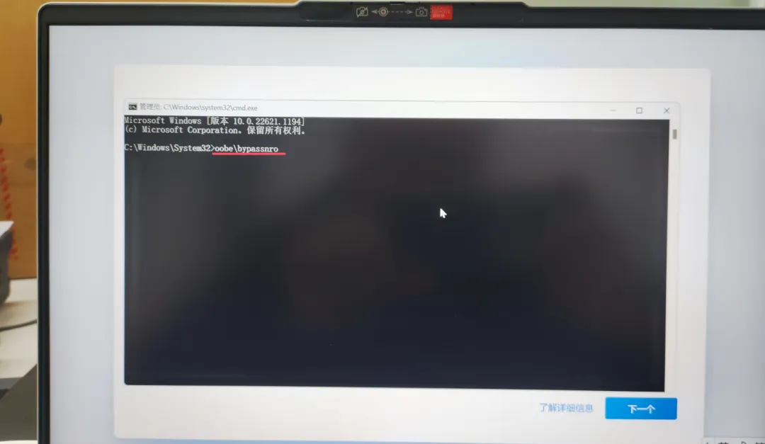 按shift+fn+f10,需要使用鼠标或者table键选择这个dos黑色窗口,然后输入oobe\bypassnro,然后回车