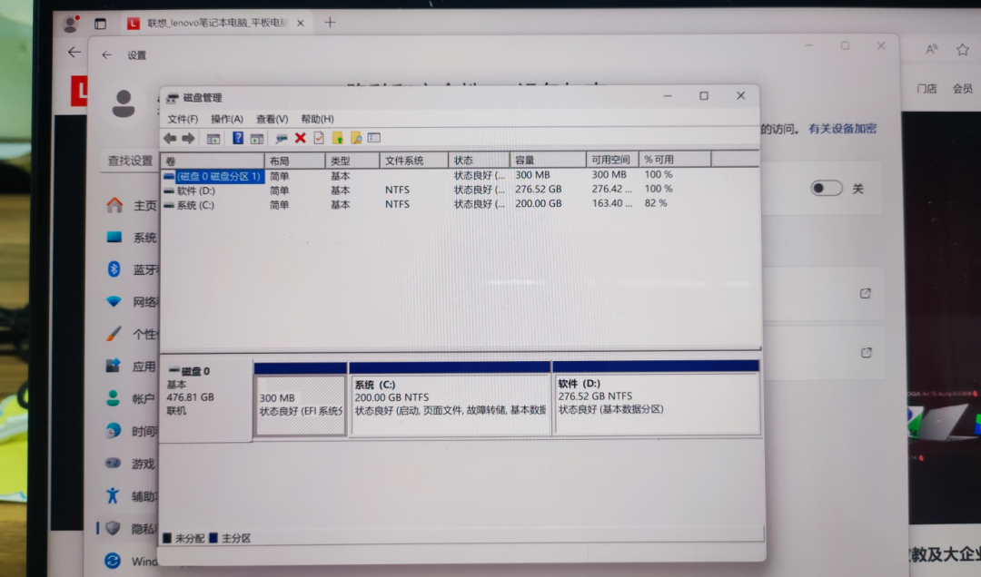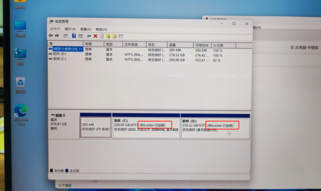 我们再来的看一下,我们打开磁盘管理器,可以看到现在的C盘和D盘都已经被bitlocker加密了。按正常情况下,你在配置win11系统的时候,是必须使用微软帐号的,但是你强制断开微软帐号登录系统,那电脑生成的驱动器对应的bitlocker密钥,是要通过网络传到你的微软帐号下面的,但是你断开了网,使用的本地帐号,那这bitlocker密钥就没有办法传到你的微软帐号。