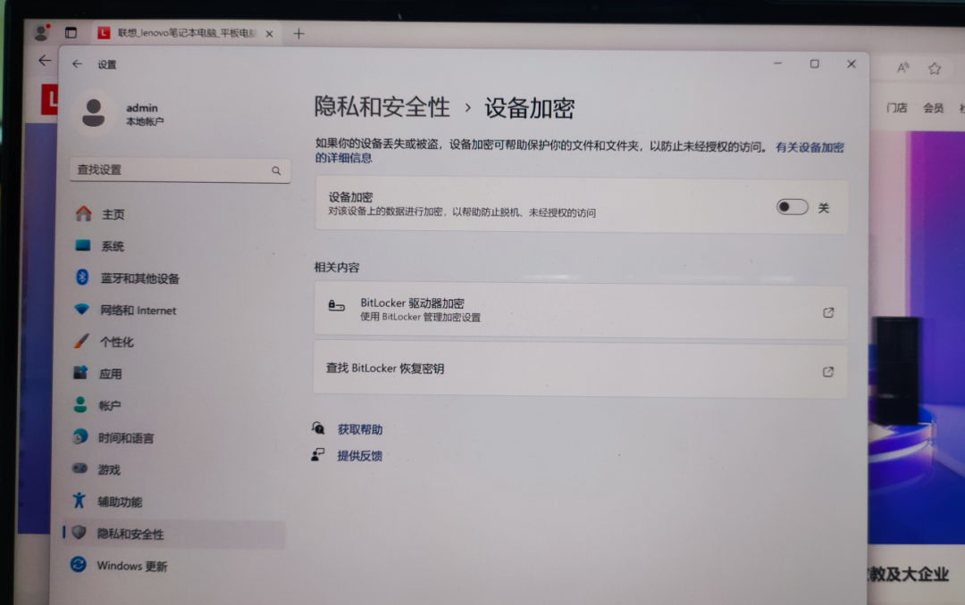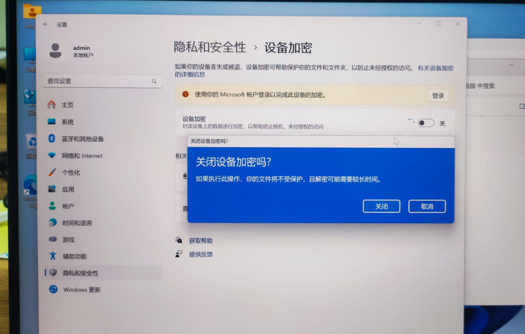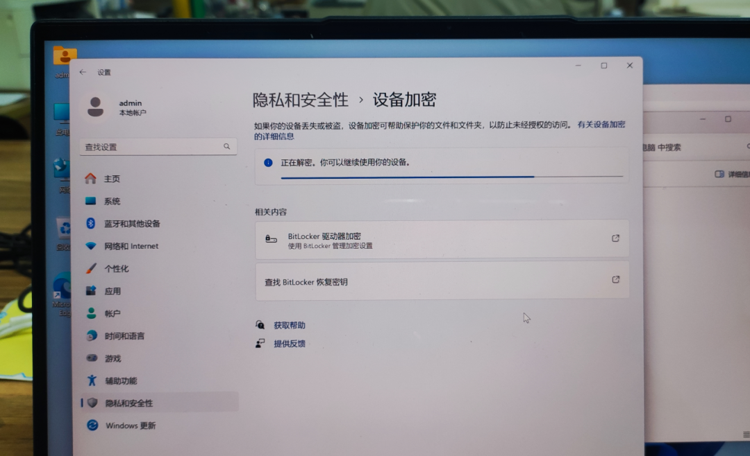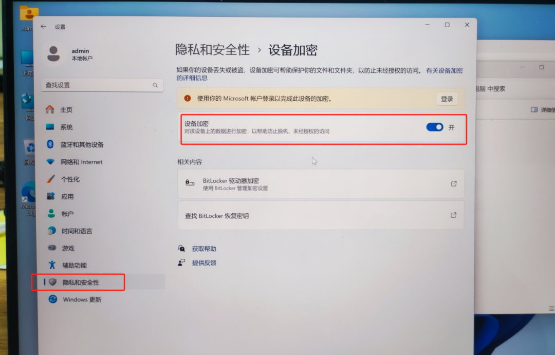 所以说,安装完系统之后,一定要不要忘记关闭bitlocker加密。在设置中,找到隐私和安全性,找到设备加密,将后面的开关,关闭。