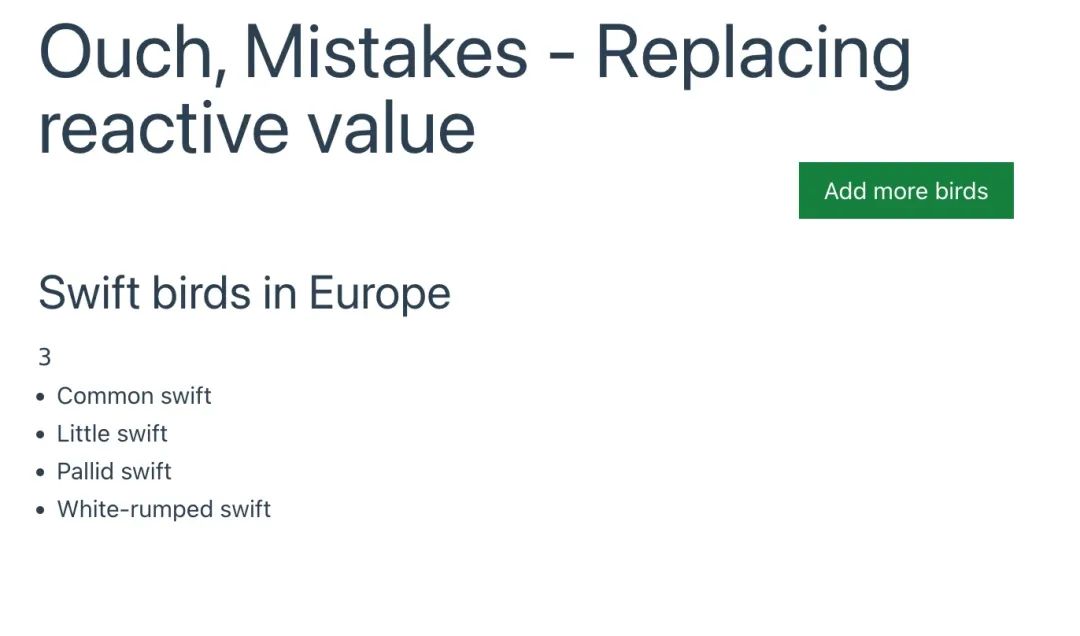 <h1 class="text-5xl">Ouch, Mistakes - Replacing reactive value</h1>