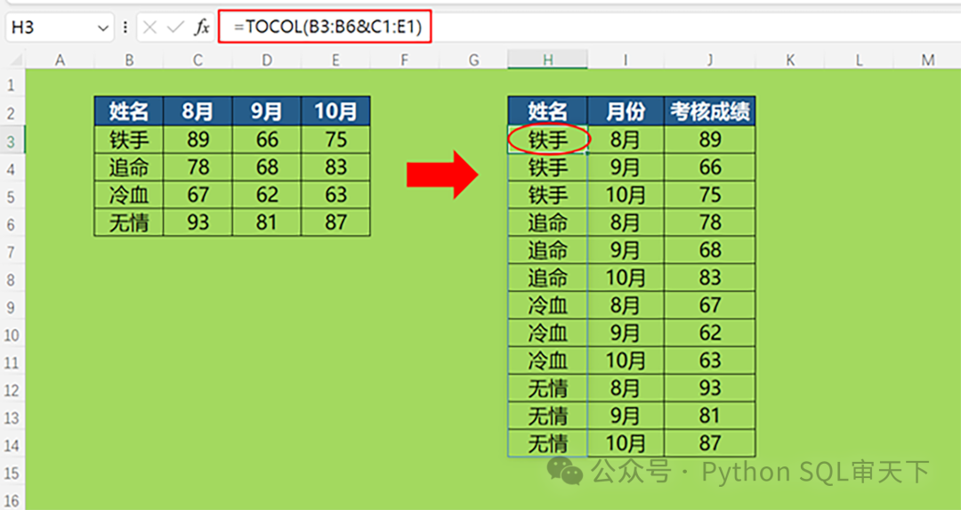 =TOCOL(C3:E6) 最后直接利用TOCOL函数获得考核成绩。