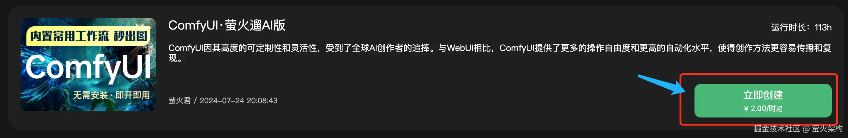 注册成功后,点击页面上的“立即创建”,即可开启 ComfyUI 应用,如下图所示: