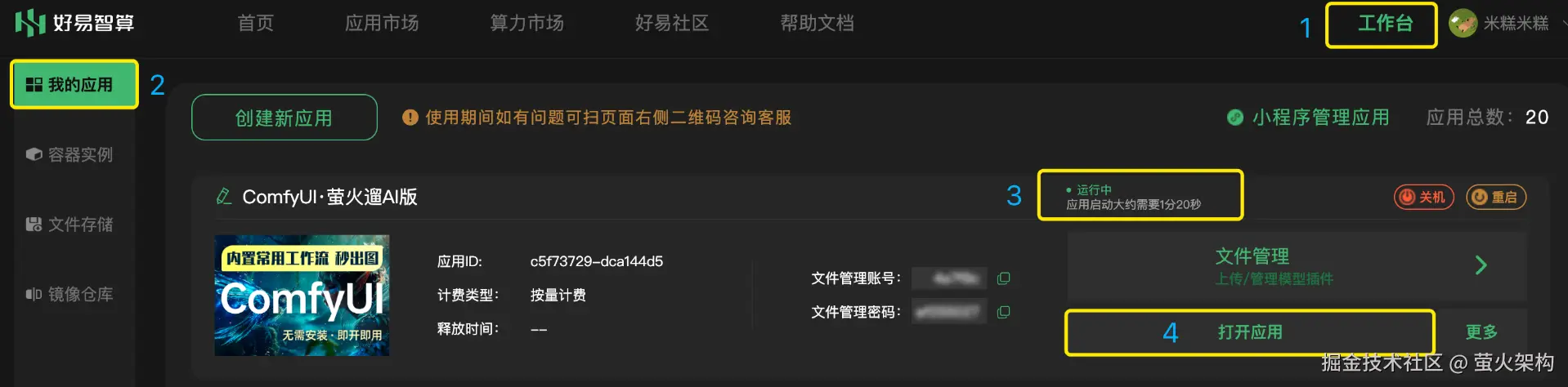 应用创建后会自动跳转至“工作台”。启动成功后,状态将显示为“运行中”,此时点击“打开应用”,即可在浏览器进入操作界面。本应用启动大约需要1-2分钟,如果打开页面显示空白,请刷新再尝试。