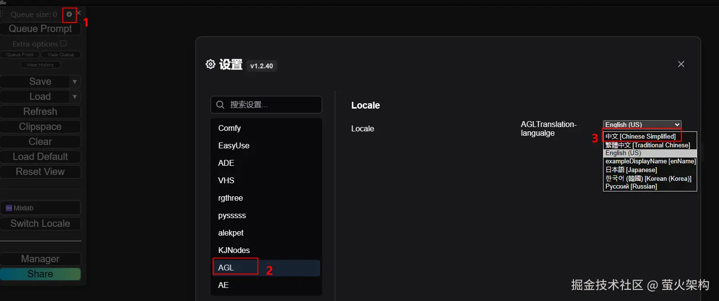ComfyUI在浏览器中启动后,我们可以先通过设置切换到中文界面: