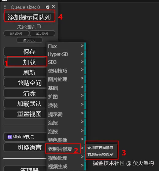 然后点击“加载”旁边的小箭头,选择一个“老照片修复”工作流,点击“添加提示词队列”,就可以开始愉快的生成了。