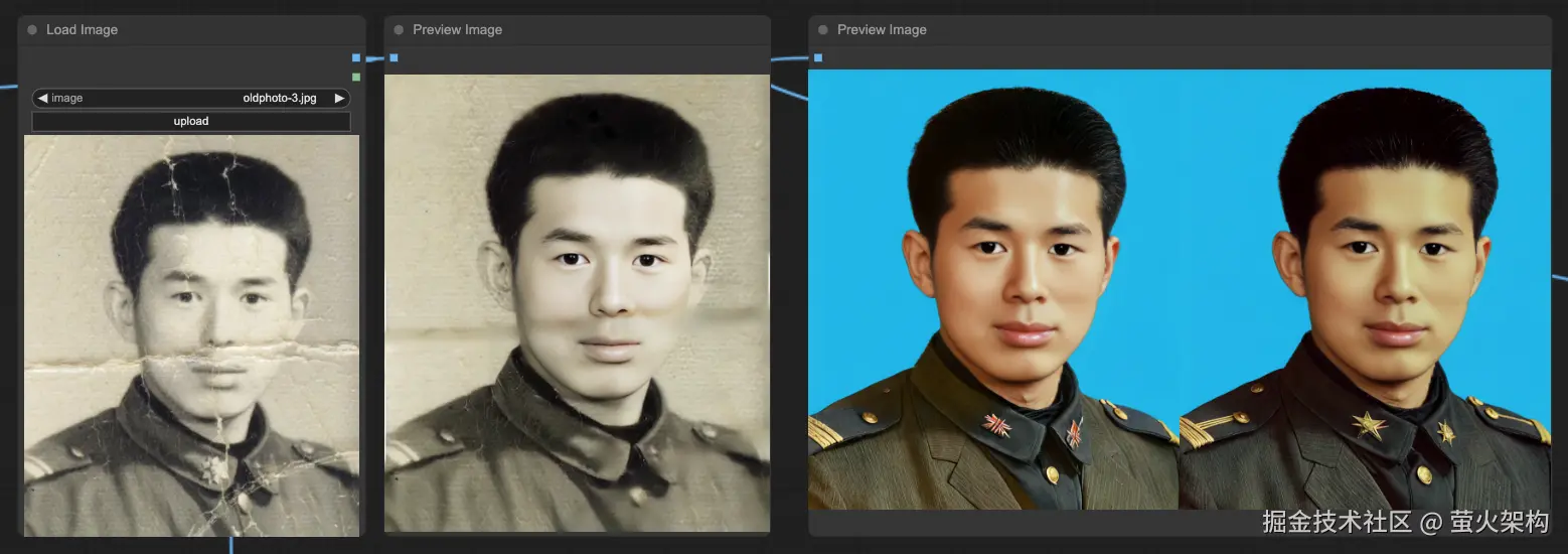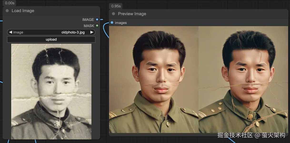 本文主要介绍使用ComfyUI工作流修复老照片的方法,经过最近几天的研究,不仅可以修复普通的模糊老照片、也可以修复有污渍、划痕和破损的老照片。使用ComfyUI工作流,我们还可以做到:只上传一张老照片,然后一键修复,无需输入任何提示词。