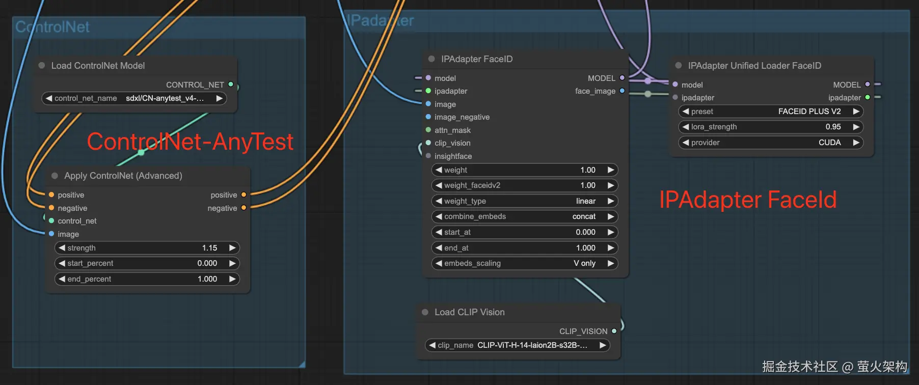 我们看看这个工作流都干了什么。首先是使用了ControlNet和IPAdapter,ControlNet可以约束画面的结构,IPAdapter则用来提取人物的面部特征,这两个节点是用来保真的,保持任务的基本形象不变。