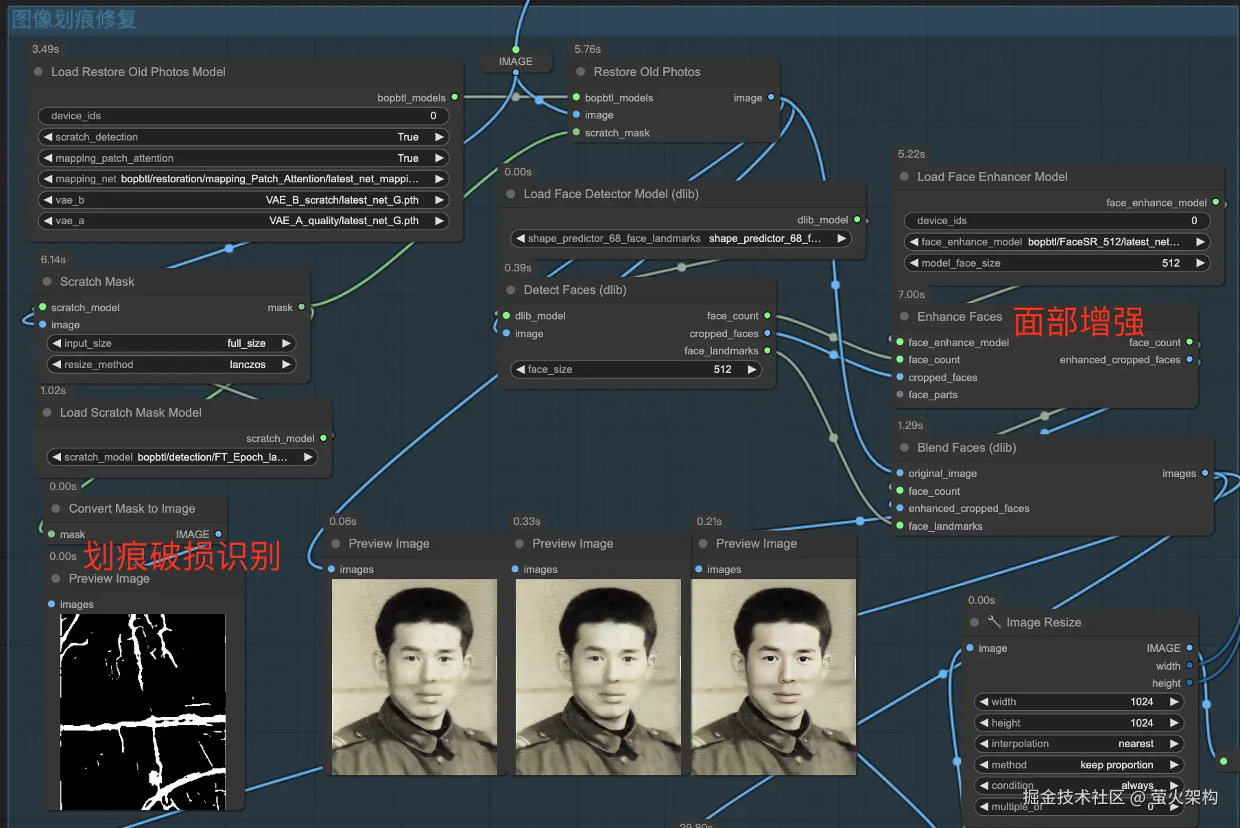 去除破损的能力主要来自这个插件:ComfyUI-Bringing-Old-Photos-Back-to-Life,它是微软开发的一个工具,可以提升低质量老照片的质量。相关节点使用如下图所示,它主要做了两件事,破损识别修复和面部增强。