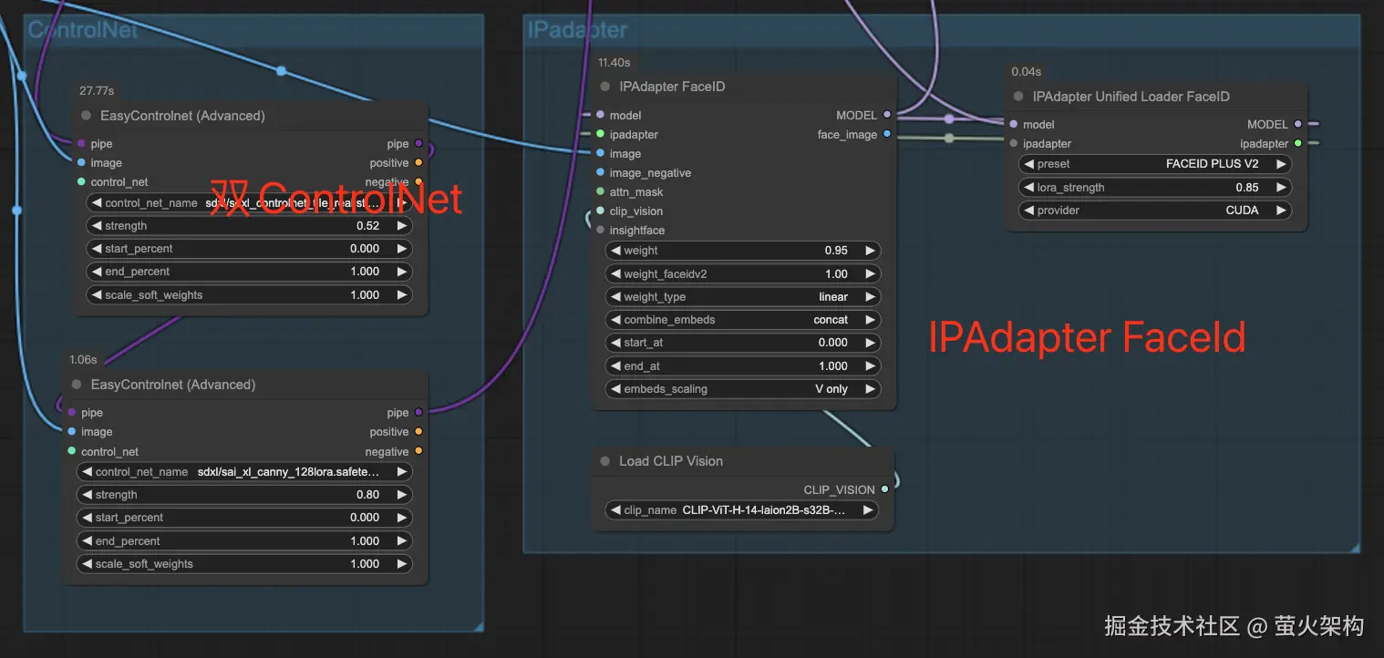 另外这个工作流也会用到ControlNet和IPAdapter,ControlNet使用了Canny和Tile,IPAdaptre使用了FaceId,作用也是约束画面结构、控制人脸形象。