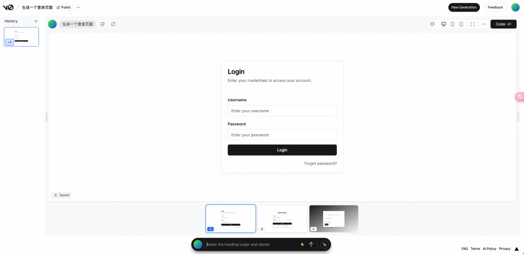 v0是由Vercel推出的开发工具,专为快速和高效的用户界面(UI)创建而设计。通过AI模型技术生成交互页面,当前官网的交互是基于shadcn/ui和Tailwind CSS,最终生成基于React、HTML的代码(后续还会支持Vue),可以直接复制到项目中使用。