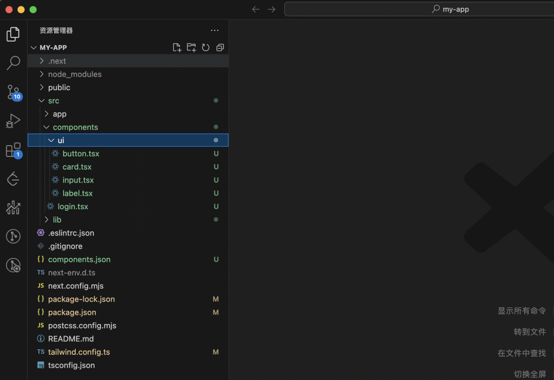 如果你的项目的技术栈是React+Next+TypeScript+Tailwind CSS,那么更方便的方式来了,首先使用npx v0@latest init 在你的项目中初始化v0,然后在v0的代码导出页面,找到该组件的id,例如XXppPDLK7op。接着在你的项目中,执行npx v0 add XXppPDLK7op命令,于是就将代码加入到你的项目中。下图是导入项目中的文件结构图: