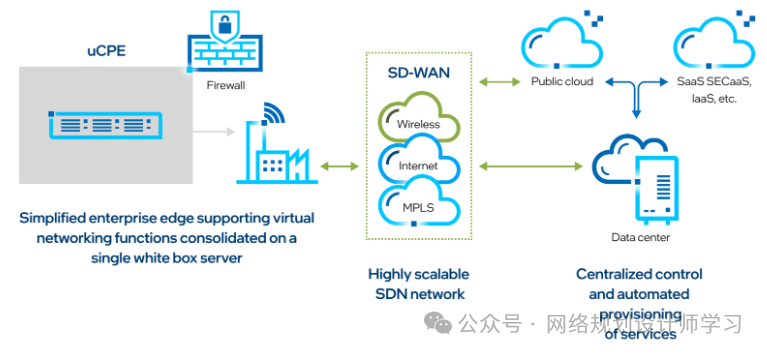 (1)基于MPLS的传统专用网络,难以应对日益增加的复杂程度和数据中心面临的瓶颈。由于 SaaS应用程序通过集中式的数据中心进行访问,因此集中式的数据中心节点成为快速访问服务的主要瓶颈,如必须要通过手动进行业务配置。 (2)企业还需要支付到各分支机构设备安装、维保、故障处理以招聘相关的维护人员的费用。 (3)随着网络中分支机构数量增加,网络的成本和复杂程度也随之增加。比如,MPLS专线带宽需求不断增加,线路租用成本也不断上升。 2、SD-WAN 利用虚拟化简化连接 SD-WAN将专线线路抽象为一个软件控制的互联网络,可通过物理宽带网络、无线网络和 MPLS网络连接。WAN功能(如交换和路由)还可以通过在简化的基础设施上运行的虚拟化网络功能 (VNF) 实现,可以在每个分支机构部署一台机架服务器用来模拟网络功能。