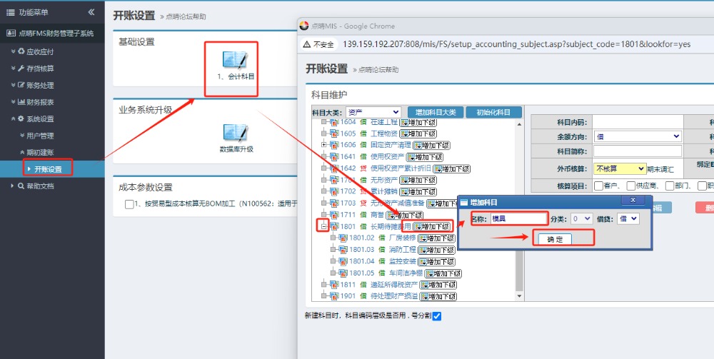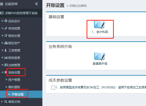 进入系统设置-->期初建账-->开账设置,选择“会计科目”。