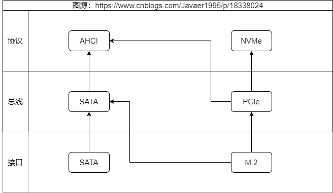 如上图所示,SATA 接口的硬盘,只能使用 SATA 总线和 AHCI 协议。 M.2 接口的硬盘,既可以使用 SATA 总线和 AHCI 协议,也可以使用 PCIe 总线和 AHCI 协议,还可以使用 PCIe 总线和 NVMe 协议。