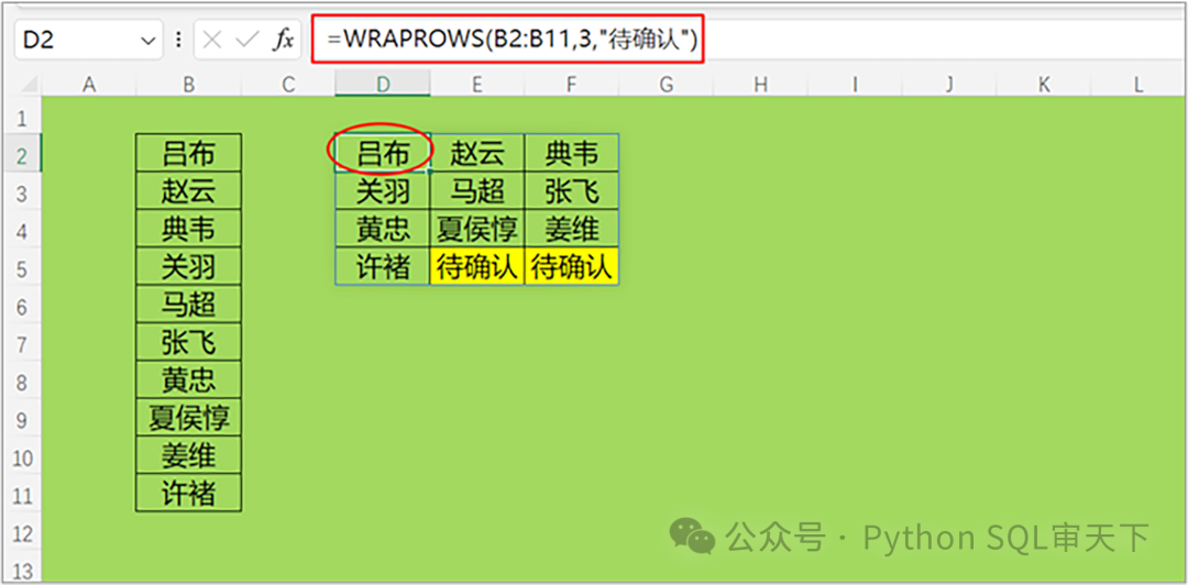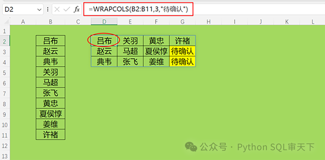 2、WRAPCOLS函数 1)基本语法 =WRAPCOLS(array, num_cols, [pad_with]) array:必需参数,表示要排列的一维数组或引用。 num_cols:必需参数,指定每列放置的元素数量。 pad_with:可选参数,用于填充空白单元格的值。 翻译成大白话就是: =WRAPCOLS(要整合的数据,指定行数,指定用来填充多余单元格的值) 2)基本用法 将B列的10位三国名将按3行进行排列,列数自动计算。 =WRAPCOLS(B2:B11,3,"待确认")