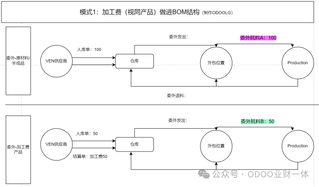 委外加工业务是制造业中常见的业务需求,也是供应链管理的难点:合作伙伴多,材料/半成品物流节点多,结算对象多;结合项目经验,我针对委外加工业务的处理,整理了2种典型的业务场景以及ODOO系统处理委外加工业务3种模式,供大家分享,这些处理都是可以在ODOO免费的社区版可以实现的。 一、2种典型场景: 场景1:企业为典型制造业,涉及原材料,半成品,成品存货管理,半成品和成品都可能通过外部加工形成。如图: 场景2:贸易公司为客户提供产品,除采购基本材料后,其余加工业务全部都是外包,公司没有仓库,也不去核算中间产品,只是核算最终成品的成本。如图: 无论哪种场景,其成品的成本核算基本都是:成品=加工材料+加工费 二、ODOO处理委外加工业务的3种模式 模式1:加工成品的BOM结构 = 材料+加工费 如图:BOM结构 在单据处理上,按照下图逻辑: 加工费视同产品,和其他材料进行同样的路线操作:采购,入库,发料,耗料;加工费在成品BOM结构中固化下来。此种模式的优点在于,能够清晰的看到 加工成品的成本结构中,加工费的比重情况。 模式2:加工成品的BOM结构 = 材料 相比较模式1,模式2的加工成品的BOM结构中不包含加工费。