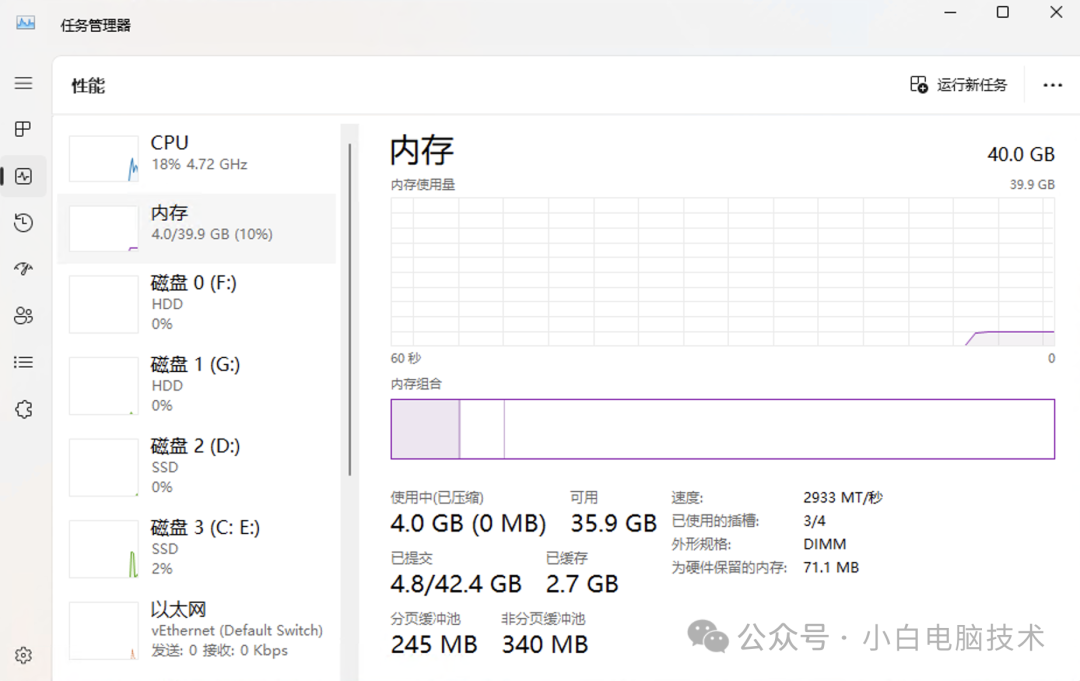小编自己的电脑在日常使用的时候,物理内存仅占10GB左右,而系统有着40GB的空间(勿喷,测试三条内存条的稳定性呢!)。刚开机的时候也才占用4GB左右的空间。