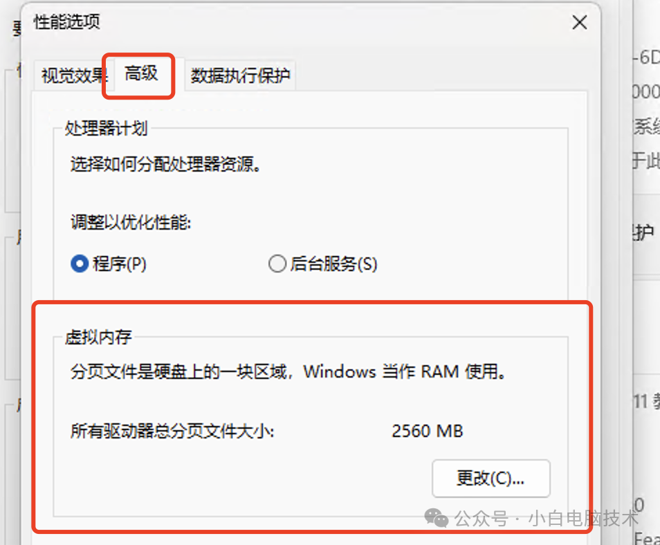 点击【高级】就能看到虚拟内存界面,点击【更改】